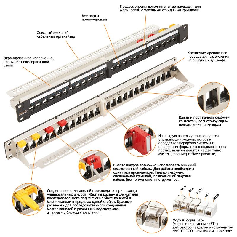 На каждую панель устанавливается специальный управляющий модуль с микроконтрол-лером, который собирает и передает информацию о подключенных портах. Модули делятся на два типа: Master (красные) и Slave (желтые). Соединение панелей между собой происходит через отдельные соединительные разъемы, расположенные на тыльной стороне. Разъемы имеют ту же цветовую маркировку, что и контроллер-модули: красные служат для последовательного подключения панелей с Master-контроллерами, желтые – для панелей со Slave-контроллерами.