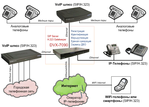 В основе IP-PBX выступила модель DVX-7090 которая позволяет коммутитировать звонки более чем 50 абонентов, в качестве которые применены телефоны с питанием по шине Ethernet - DPPH-150SE/E/F1. Питание осуществлялось от коммутатров имеющих бесперебойное питание. Данная схема позволила все решение сделать зарезервированным по питанию и самое важное затраты заказчика были существенно ниже, за счет того, что для телефонии и передачи данных реализована в рамках проекта одна и таже сеть.
